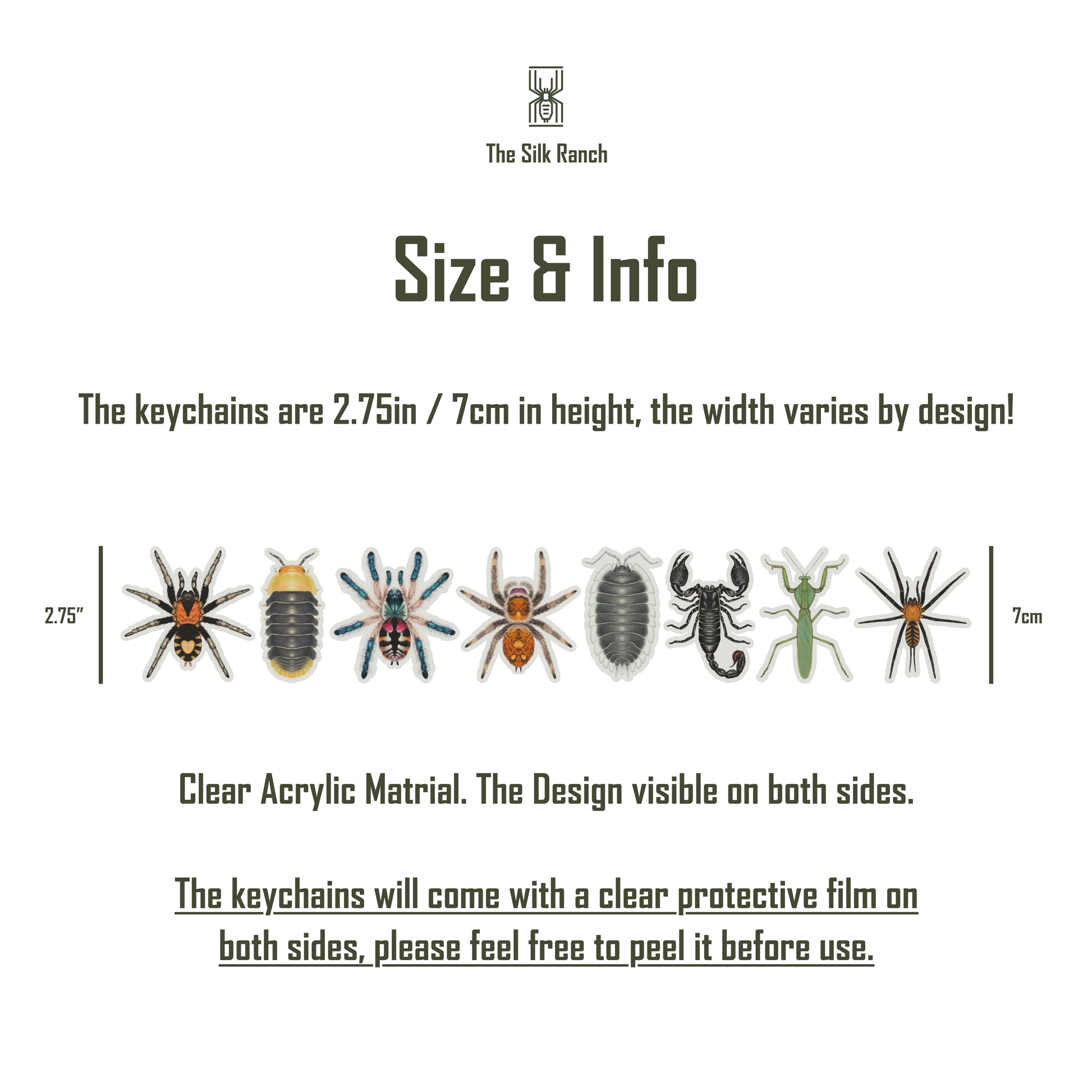 This lightweight yet eye-catching keychain is a unique hobby accessory, perfect for backpacks, keys, display bags, or gifting to fellow invert lovers. Available in 2.75 cm or 7 cm tall, with width varying by design, every piece reflects The Silk Ranch’s signature style—bold, educational, and unmistakably original.